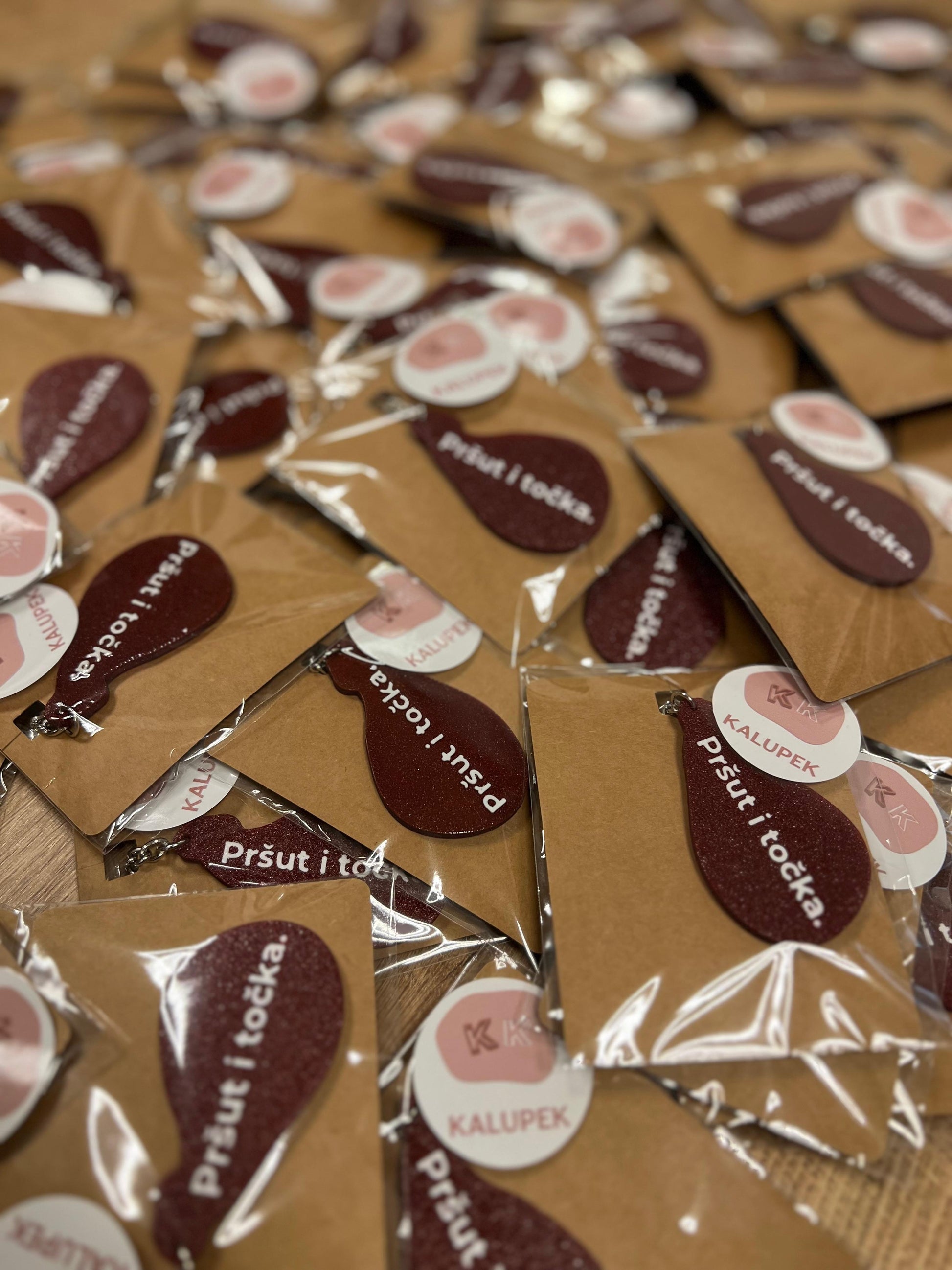 Na fotografijama je prikazan primjer privjesaka i pakiranja izrađenih za trgovinu Pršut i točka.